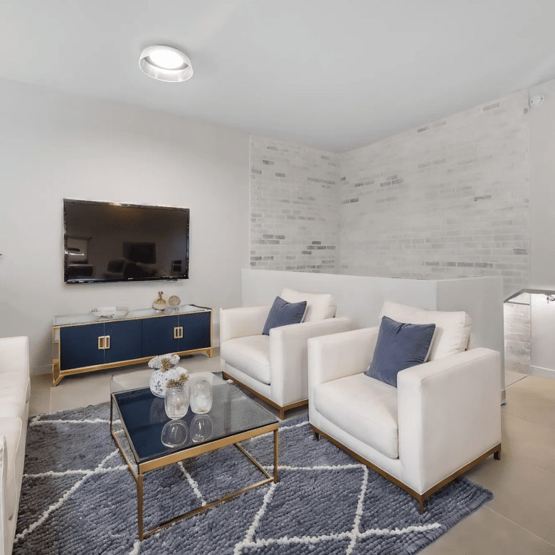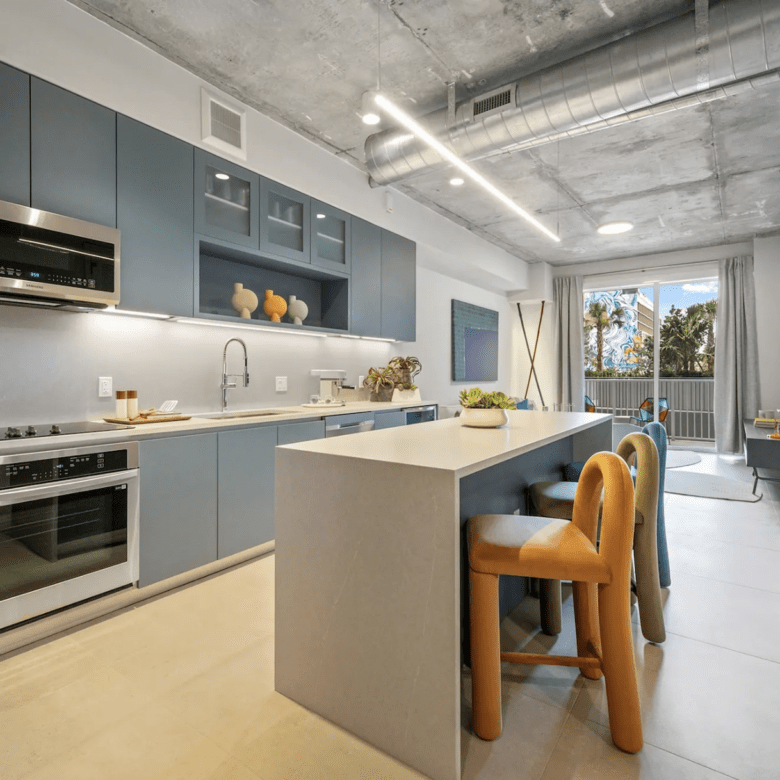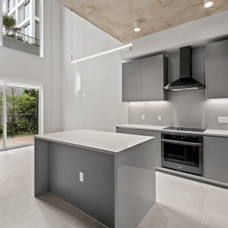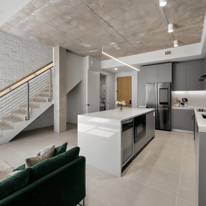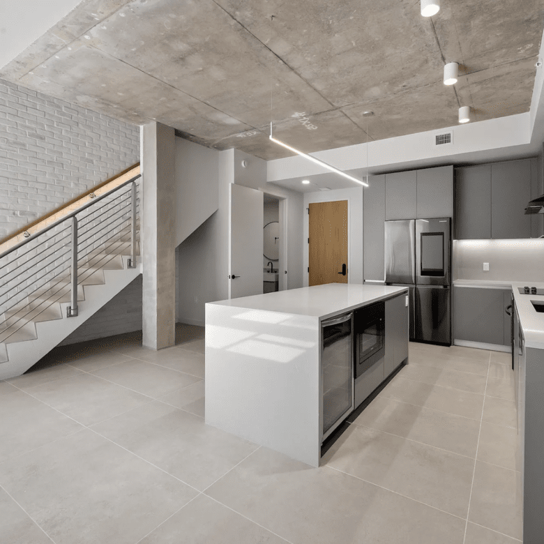 Experience modern Miami living in this stunning 3-bedroom, 2-bath duplex featuring a sleek, contemporary design from top to bottom. Exposed concrete ceilings, white brick accent walls, and an open-concept layout create a bright, airy feel as soon as you walk in. The expansive kitchen showcases clean-lined cabinetry, a waterfall island with extra storage, and stainless-steel appliances—ideal for both everyday cooking and entertaining. A striking metal-and-wood staircase leads to the upper level, adding an industrial-chic statement to the space. Large-format tiles flow throughout the home, emphasizing its spaciousness and tying each area together seamlessly.